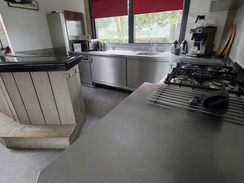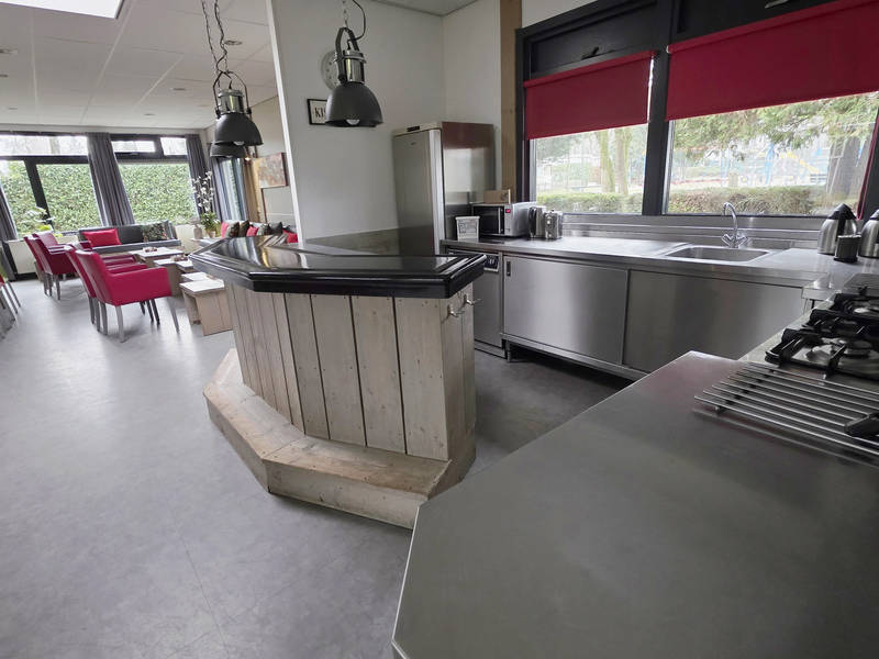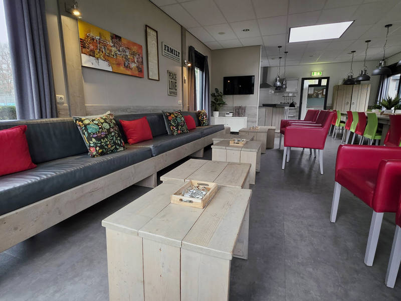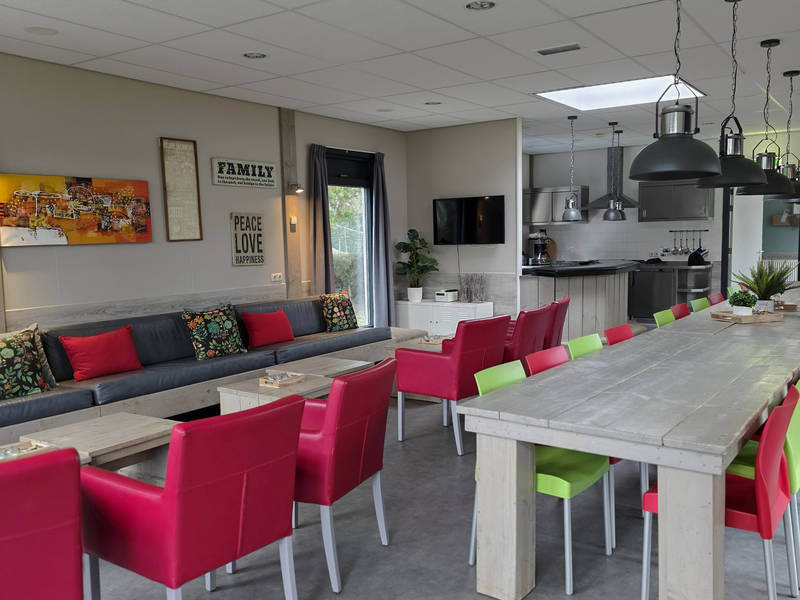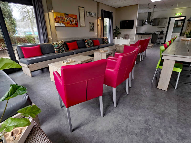 Im zentralen Bereich können Sie im großen Wohnzimmer entspannen, das mit einer Bar und ausreichend Sitzgelegenheiten ausgestattet ist. Die offene Küche ist komplett ausgestattet und lädt zum gemeinsamen Kochen ein. Vom Wohnzimmer aus können Sie die Kinder im Auge behalten, die sich auf dem großen Spielplatz vergnügen.